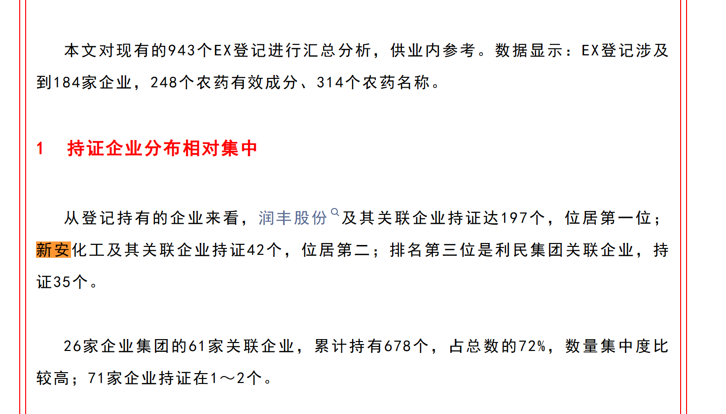 农药资讯网的统计,新安股份及其关联企业仅供境外使用农药登记(EX登记)持证数量行业排名第二。