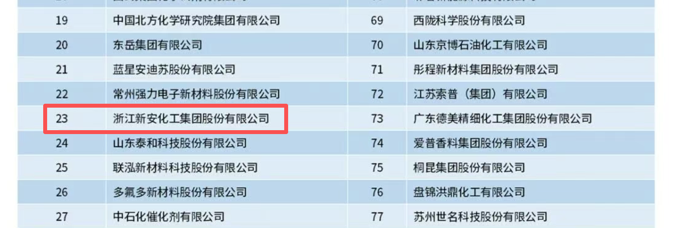 新安股份入选2025中国精细化工TOP100名单,位列第23位。