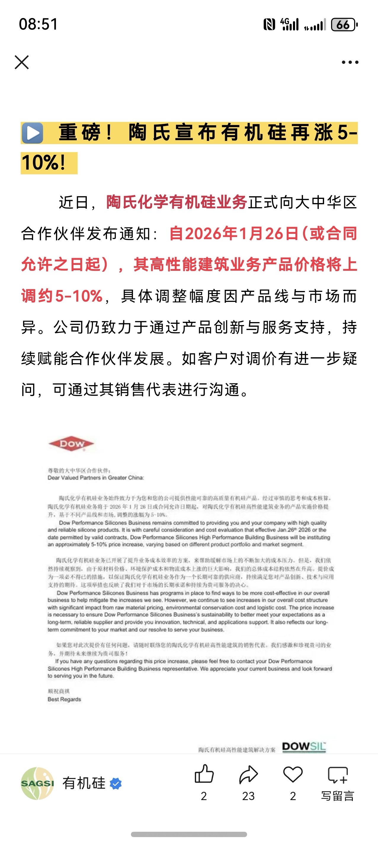 $新安股份(SH600596)$ 有机硅继续涨价中