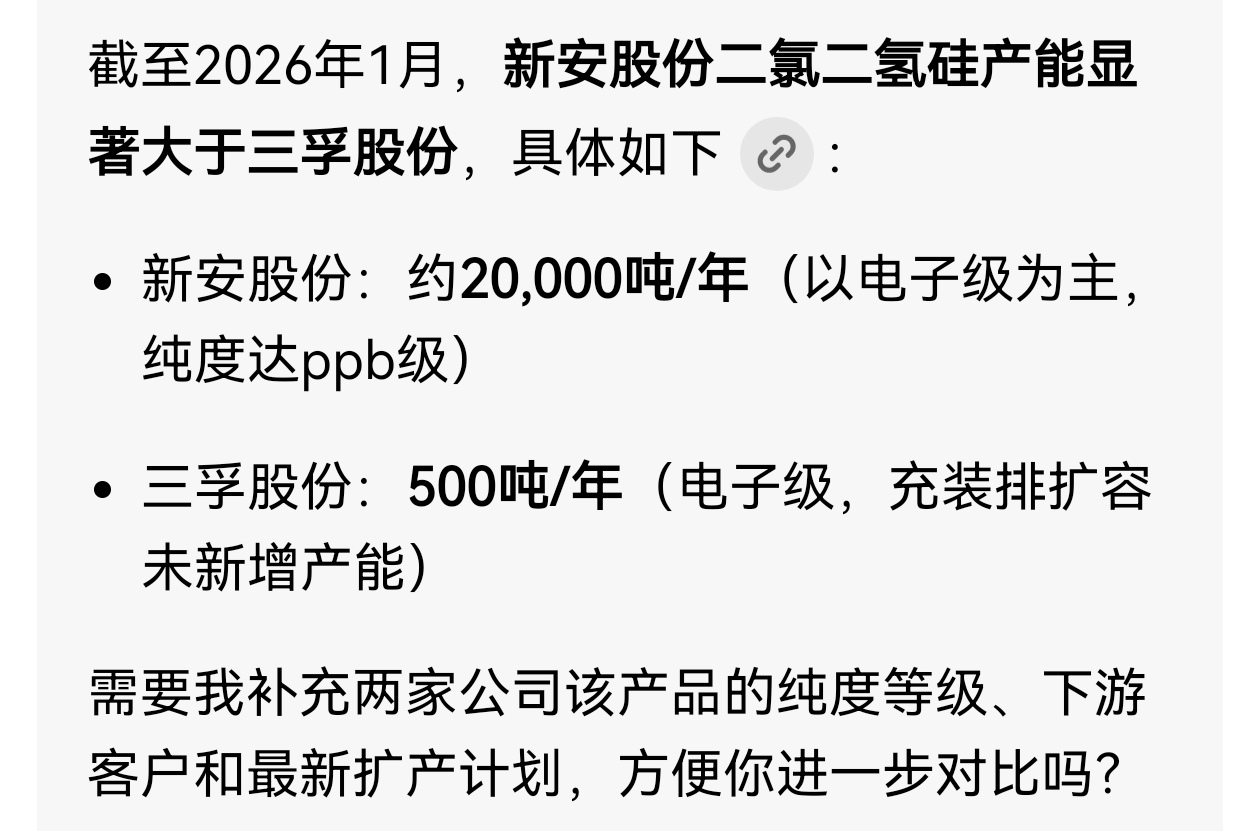 $新安股份(SH600596)$ 新安二氯二氢硅产能显著大于三孚。