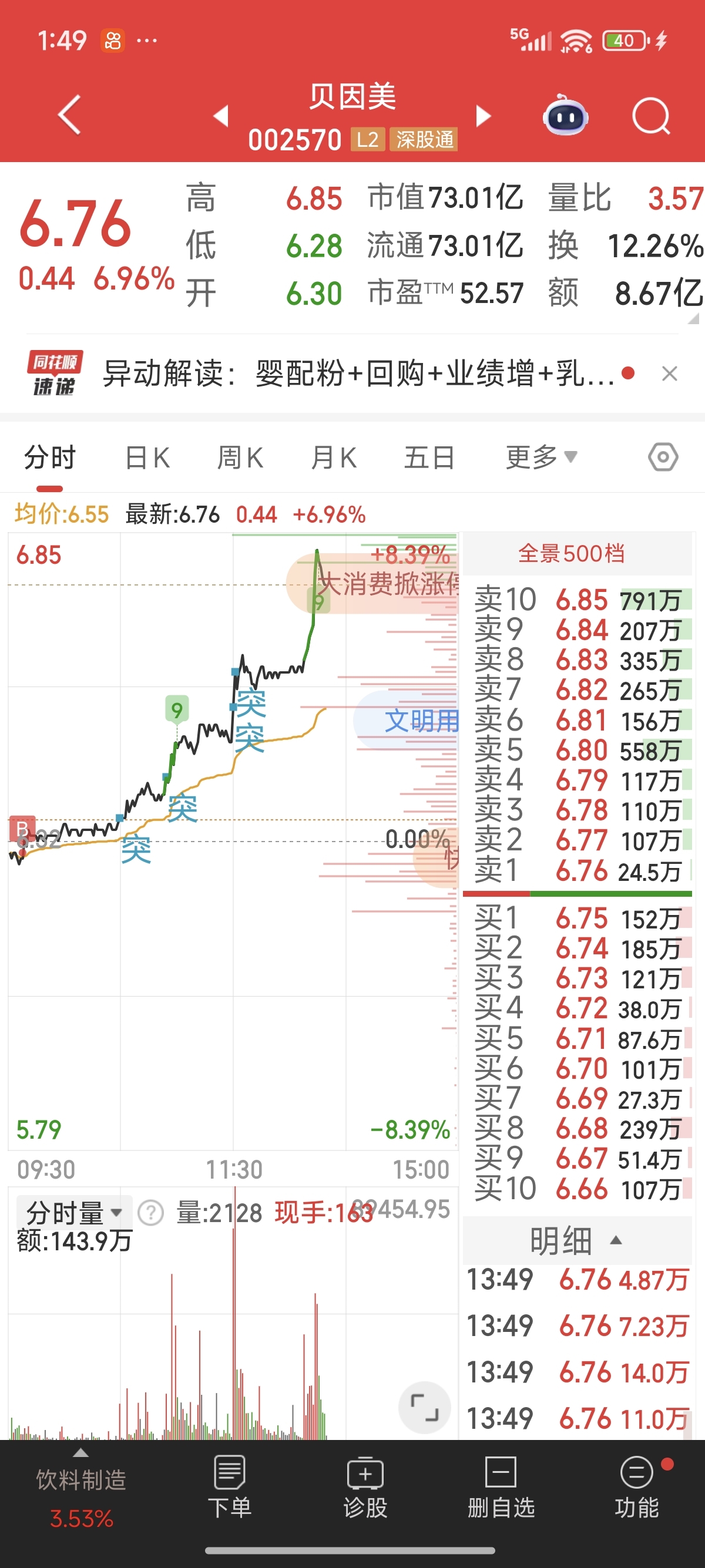 $光明乳业(SH600597)$ 还以为涨停了,今天持仓的乳业基本都起飞了,除了光明和燕塘。。。