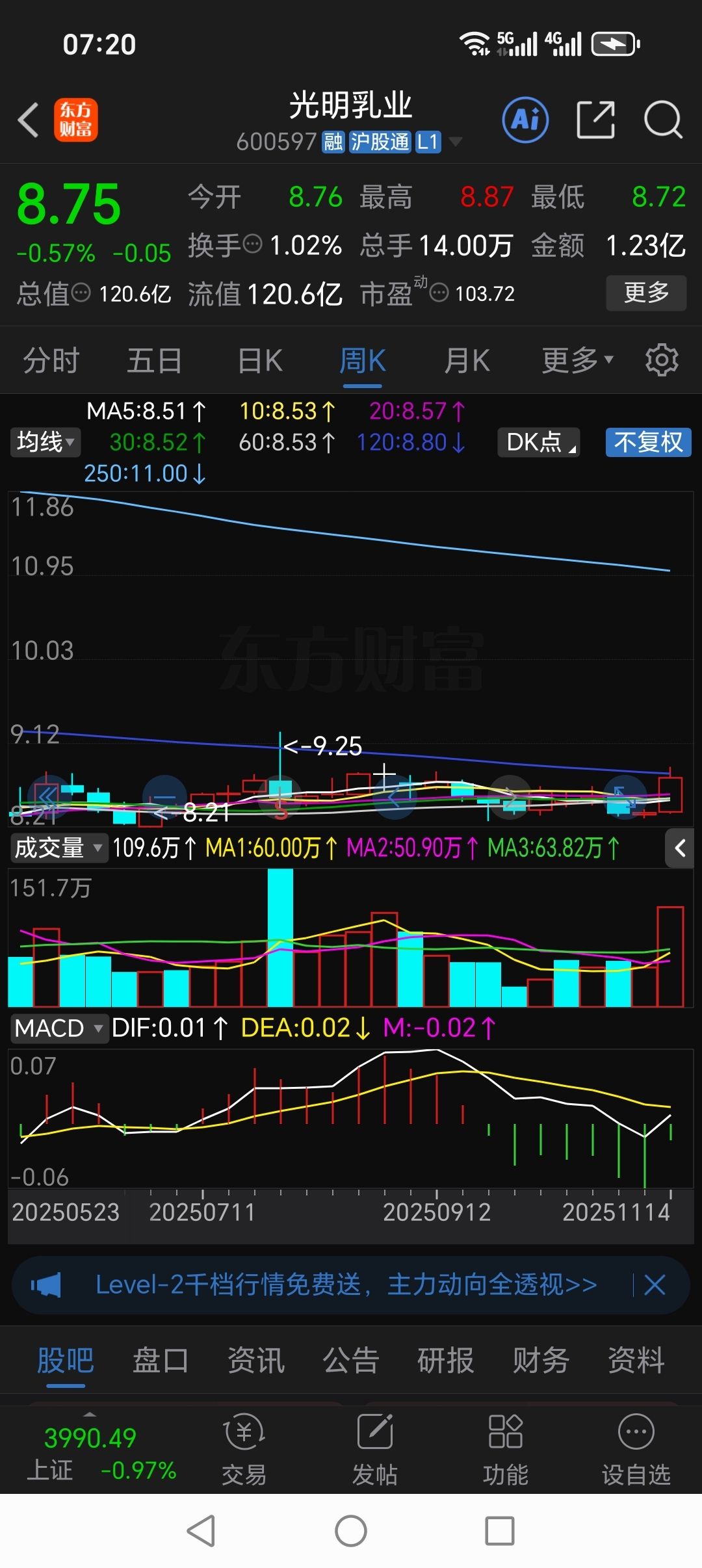 $光明乳业(SH600597)$ 周线收关是不错的!五线穿阳!有上涨的意愿!看多!不喜勿喷!
