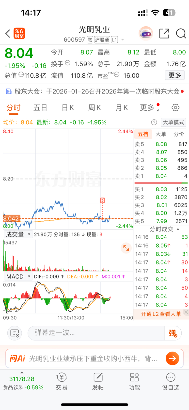 $光明乳业(SH600597)$ 兄弟们我进来了,明天可以安心跌了