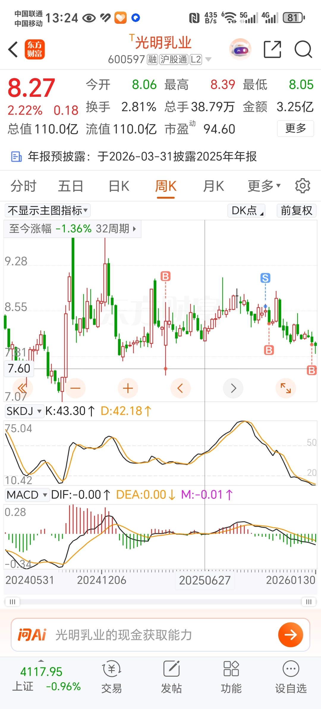 年报亏损,2026年一季报同比2025年一季报估计也是同比少了,感觉光明乳业会给