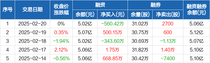 北大荒:融资净偿还560.42万元,融资余额5.02亿元(02-20)