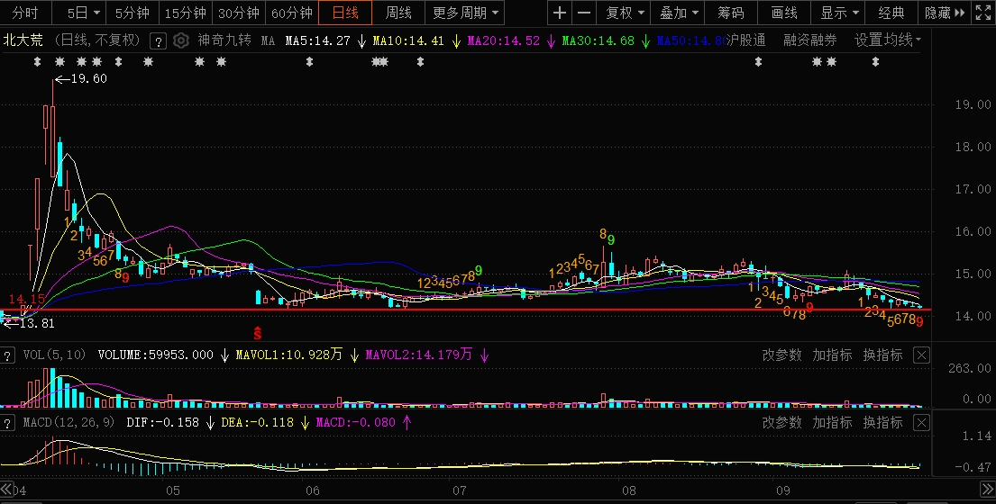 $北大荒(SH600598)$ 这个位置感觉相当不错啊,横了这么久会跌破支撑线吗?我觉得概率是极小极小的。而且迪马克序列走出低九,正好又打在支撑线上,这个共振向上必须有。只不过这票不在主线上,反弹也会比较墨迹,追求资金利用率的兄弟们谨慎。