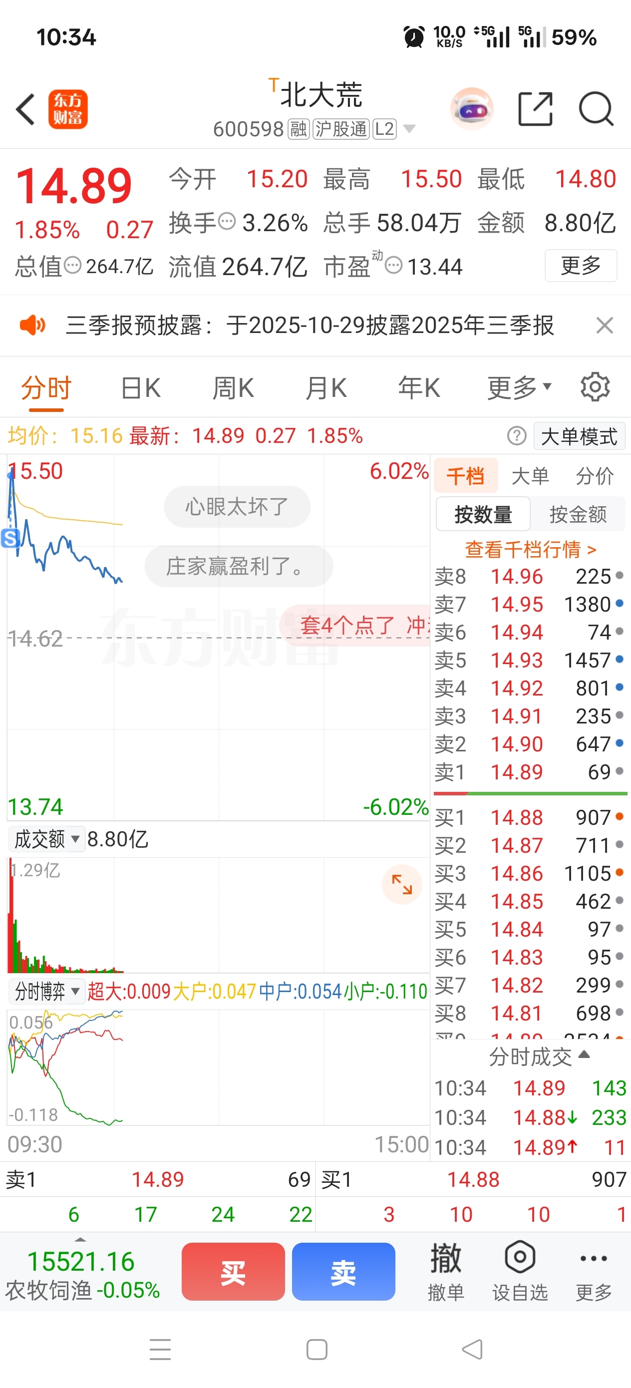 $北大荒(SH600598)$ 本来预期涨停的,结果对面又怂了,这就没搞头了,15.40出了,等要谈判那几天在买回来