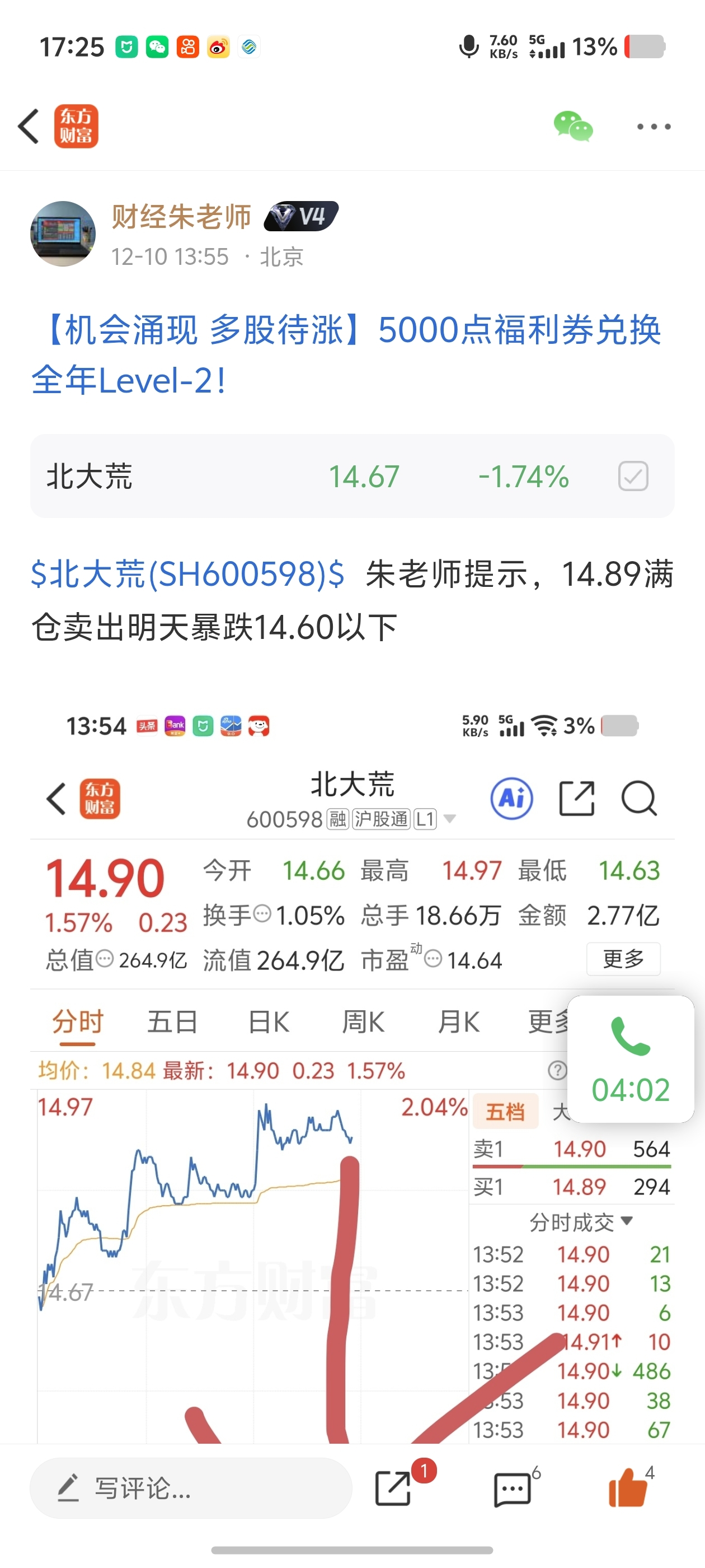 $北大荒(SH600598)$ 朱老师提示这波看14.36
