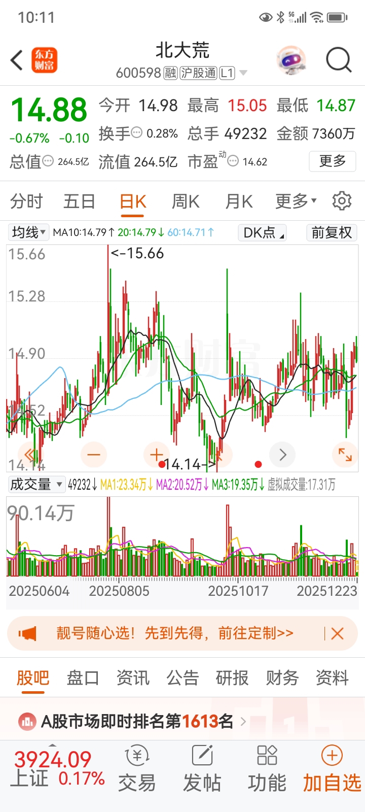 $北大荒(SH600598)$ 你再这么半死不活一个月,我就。。。。。