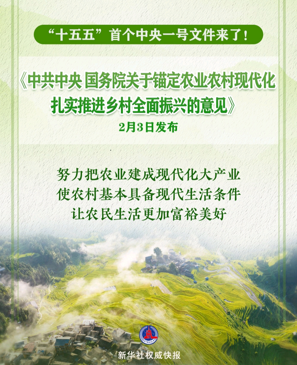 具体来看,《中共中央 国务院关于锚定农业农村现代化 扎实推进乡村全面振兴的意见》提出,锚定农业农村现代化,以改革创新为根本动力,提高强农惠农富农政策效能,建成现代化大产业、使农村基本具备现代生活条件、让农民生活更加富裕美好,为推进中国式现代化提供基础支撑。