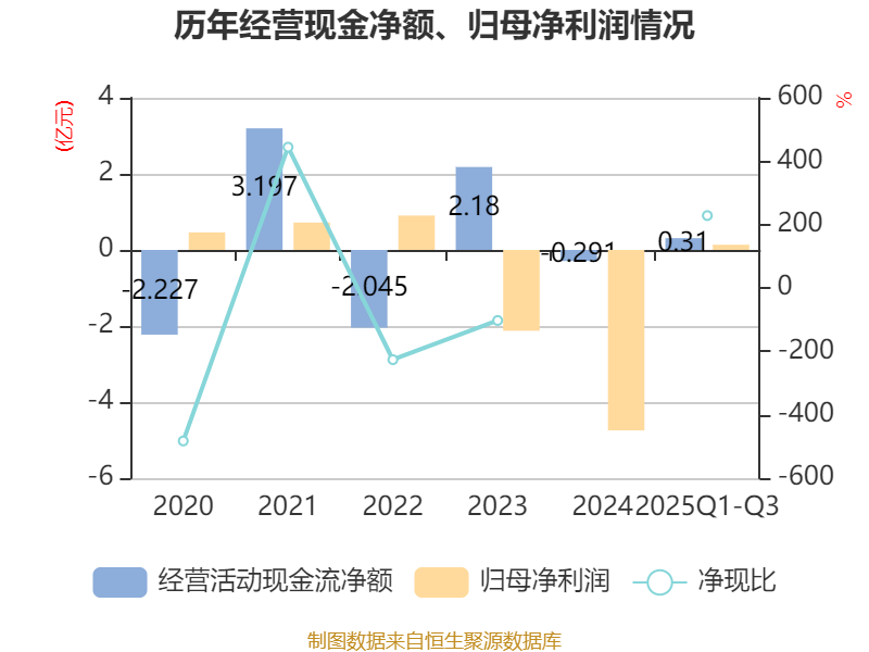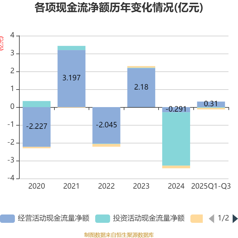 2025年前三季度,公司经营活动现金流净额为3096.91万元,同比增长135.79%;筹资活动现金流净额-939.59万元,同比减少6.47万元;投资活动现金流净额-354.8万元,上年同期为-116.91万元。