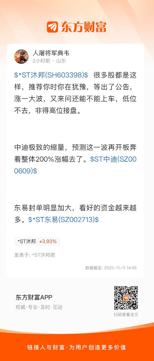 $*ST沐邦(SH603398)$  很多股都是这样,推荐你时你在犹豫,等出了公告,涨一大波,又来问还能不能上车,低位不去,非得高位接盘。