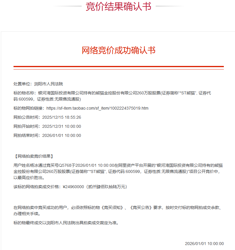 杨冰出价2496万元成功竞得*ST熊猫260万股