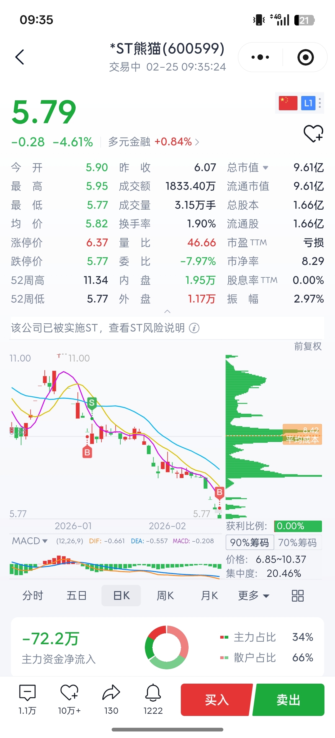 $*ST熊猫(SH600599)$ 5.77可以干了。