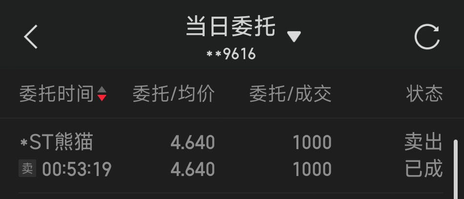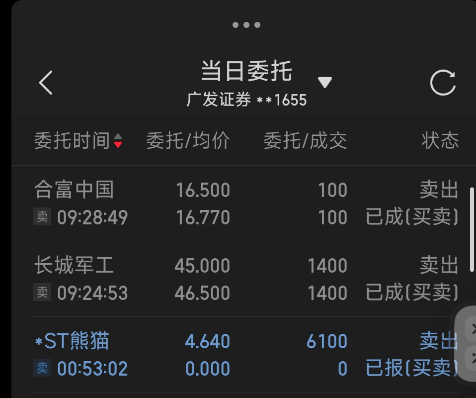 $*ST熊猫(SH600599)$ 我另一个账户同样是凌晨00:53分挂的隔夜单。9:30分11秒一开盘就出来了。广发不行看样子,广发还是先挂的,到现在还没出来