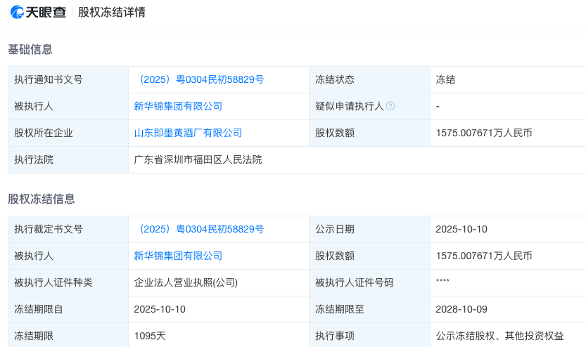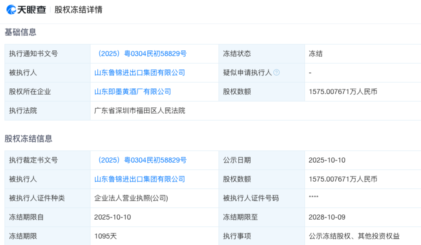据天眼查信息,近日,山东即墨黄酒厂有限公司约1575万元股权被冻结,冻结期限自2025年10月10日至2028年10月9日,由广东省深圳市福田区人民法院执行。
