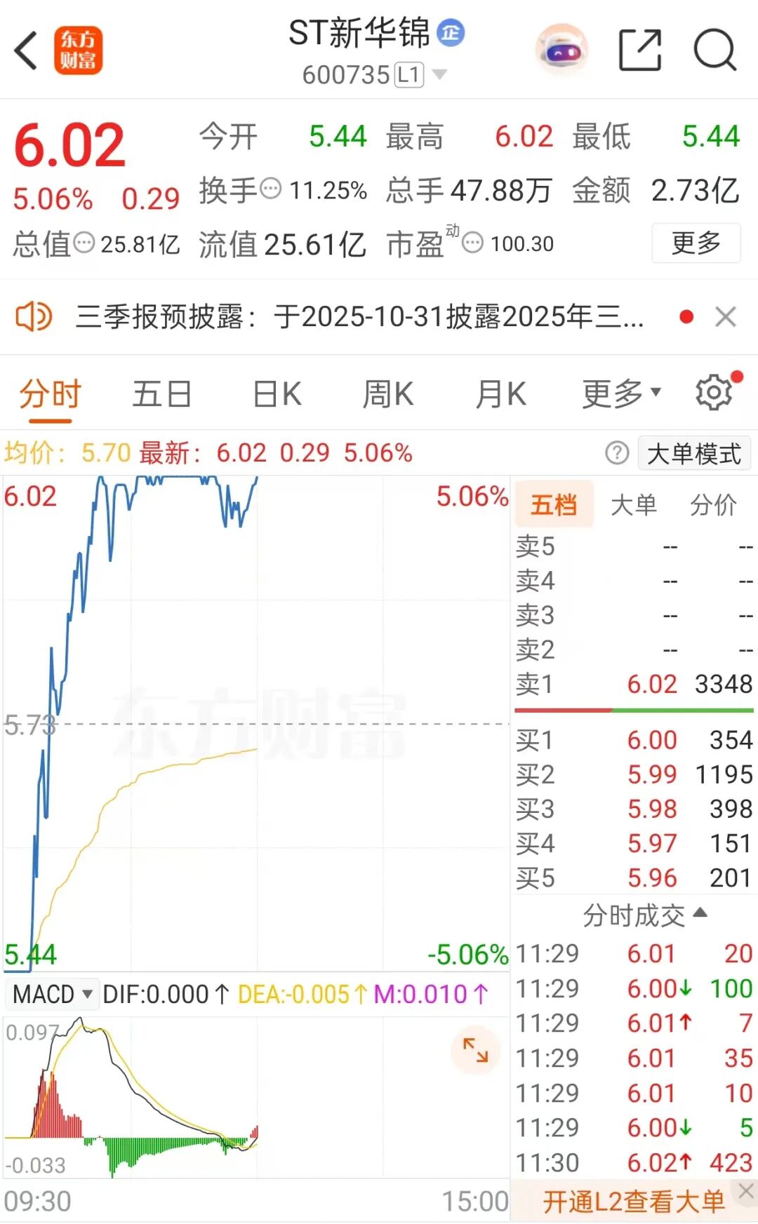 10月27日,ST新华锦以跌停开盘,但随后震荡走高。截至午间收盘,ST新华锦涨停,报6.02元/股。