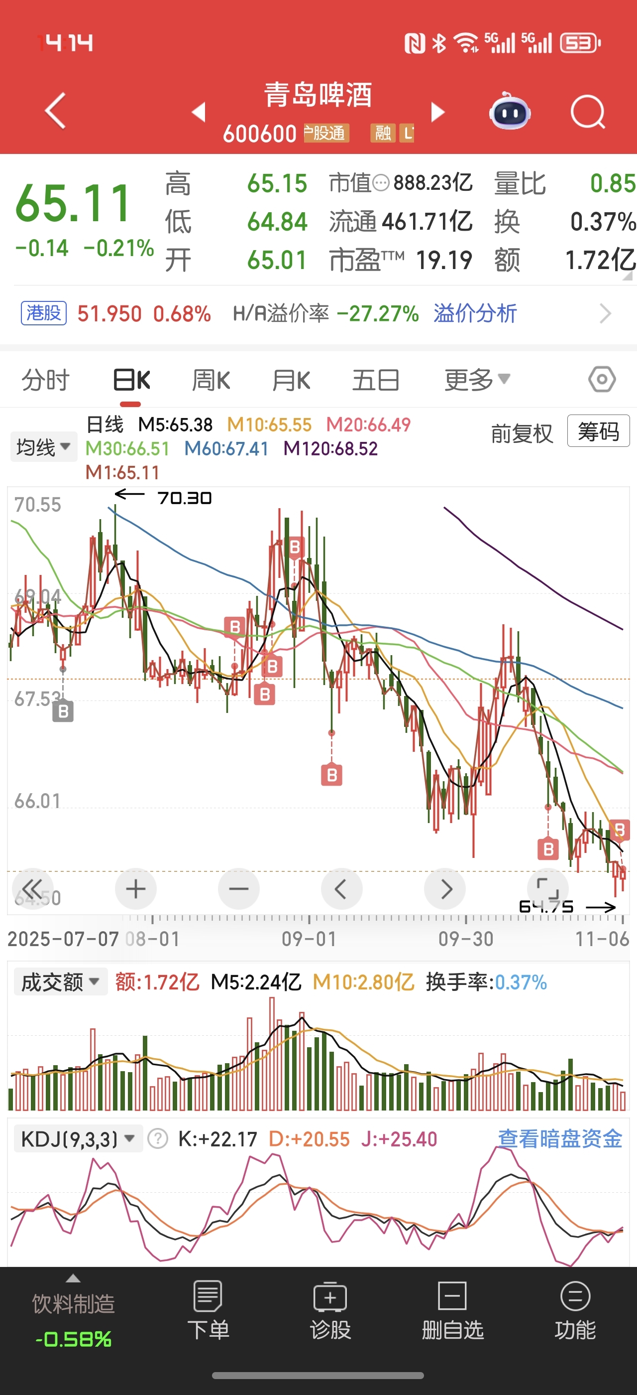 $青岛啤酒(SH600600)$  你继续 越跌越加