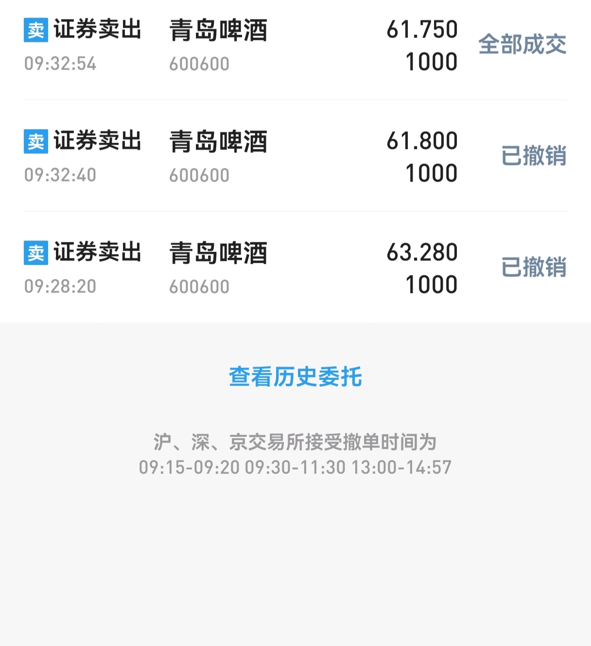 $青岛啤酒(SH600600)$ 早盘挂单没出,撤单一直撤不了,撤了两分钟才卖出。横了一天收盘竞价杀了一波,真好
