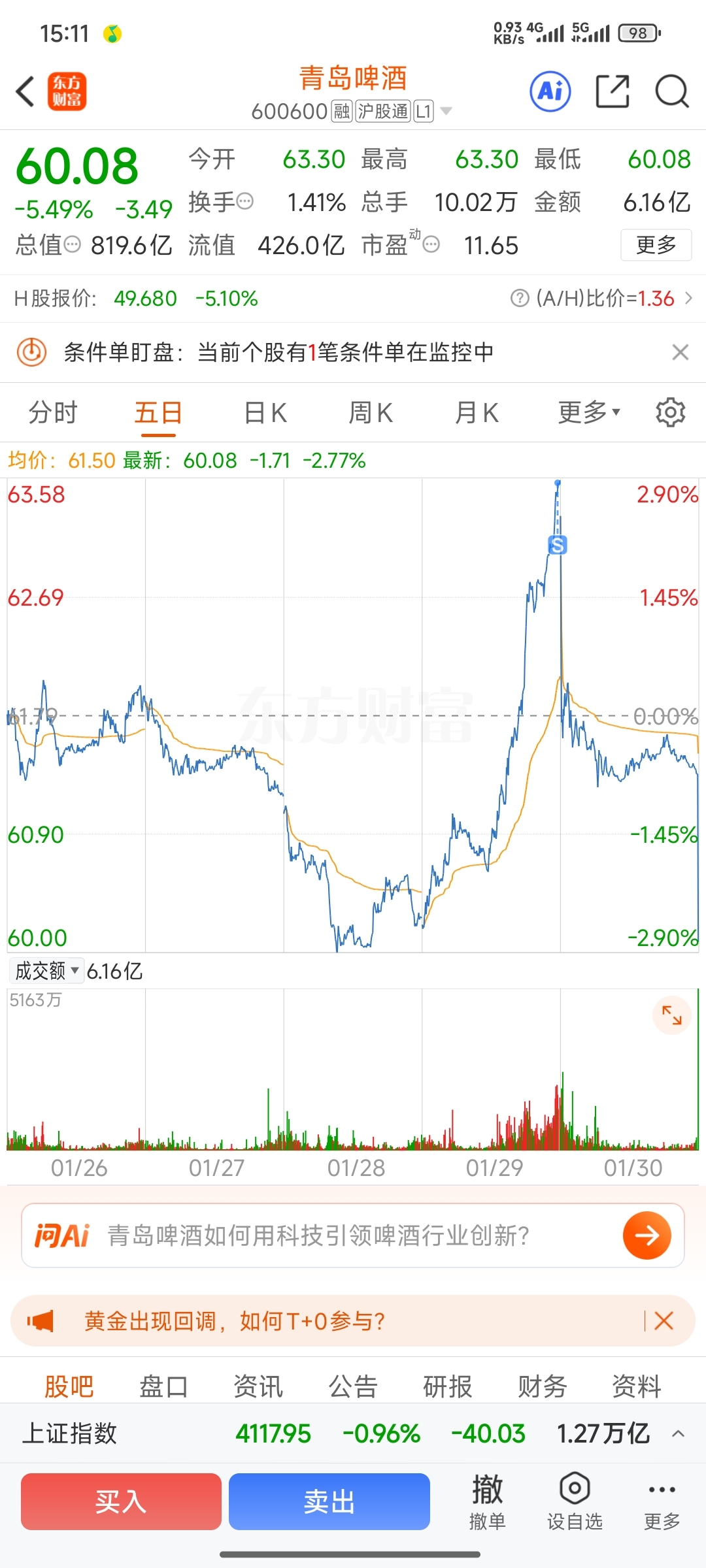 $青岛啤酒(SH600600)$ 真拉胯,还好昨天高位出了半仓