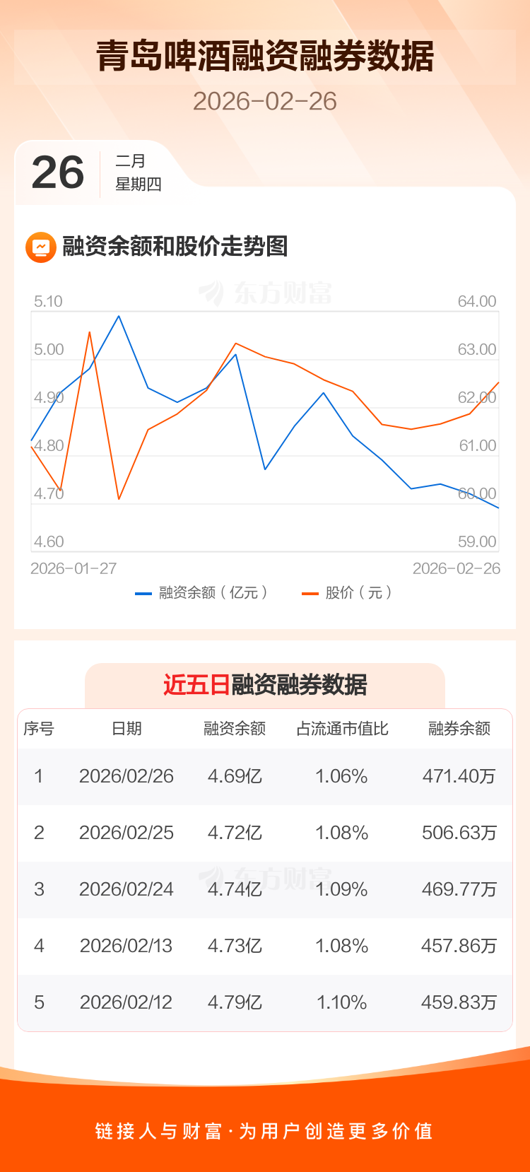 交易所最新数据显示,青岛啤酒于2026年2月26日获融资买入1938.98万元,融资偿还2246.05万元,当日融资净偿还307.07万元。目前,该股融资余额4.69亿,占流通市值比例为1.06%。