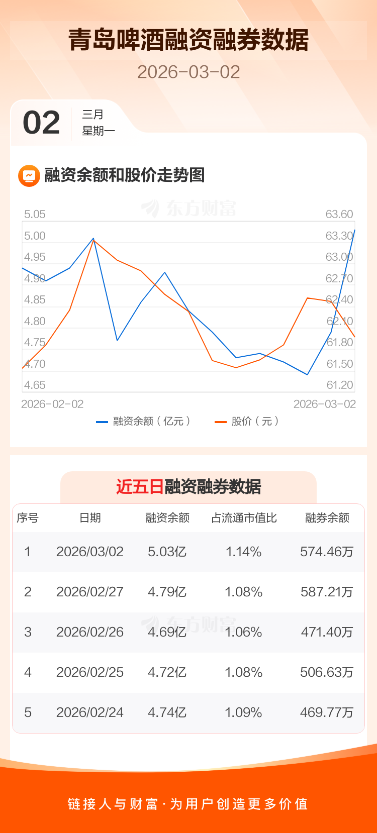 交易所最新数据显示,青岛啤酒于2026年3月2日获融资买入3924.99万元,融资偿还1490.37万元,当日融资净买入2434.61万元。目前,该股融资余额5.03亿,占流通市值比例为1.14%。