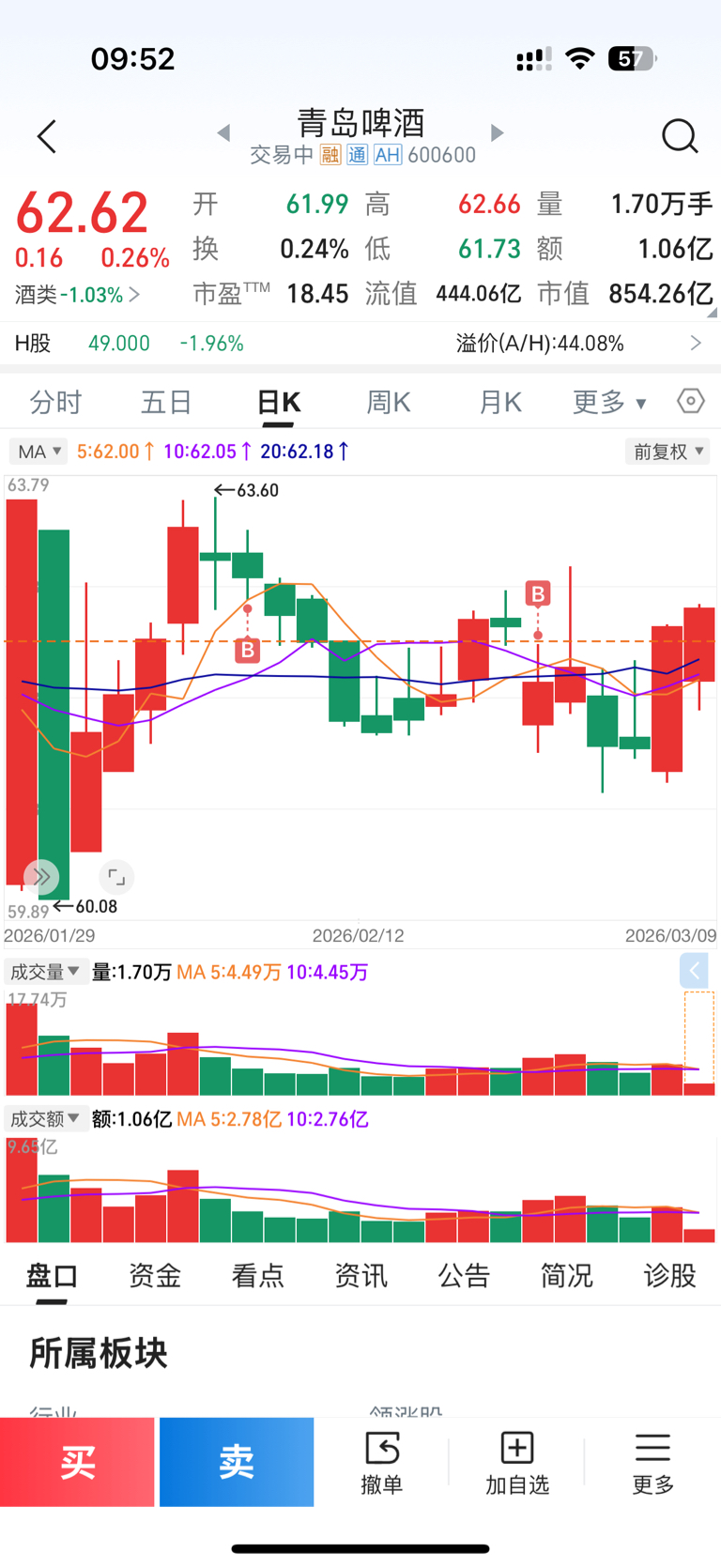 $青岛啤酒(SH600600)$ 有效61.8支撑位 最大压力67