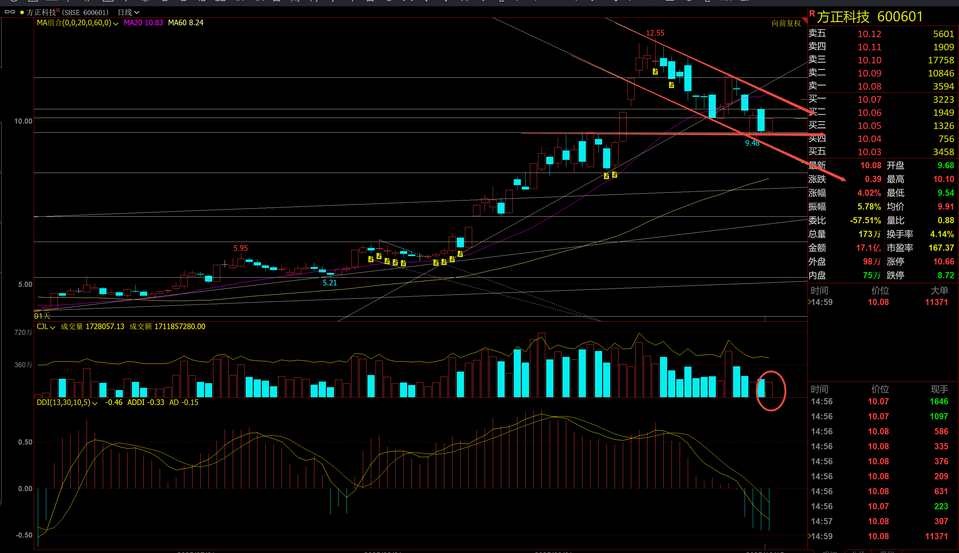 方正科技10月15日分析——暂时企稳。今天方正科技按照昨天第2个方案走,这个双线支撑位有效,股价也没有创新低,并且股价停在了高支撑,量能配合相对可以。今天收盘股价很有意思,停在了10.08的支撑位上。从目前来看,股价依然在下降通道内运行。接下来,要想走强,必须要有跟随,即明天要创新高,同时,量能也要配合,没有突破下降通道之前,要时刻保持警惕,一旦量价配合不到位,股价就会创新低。