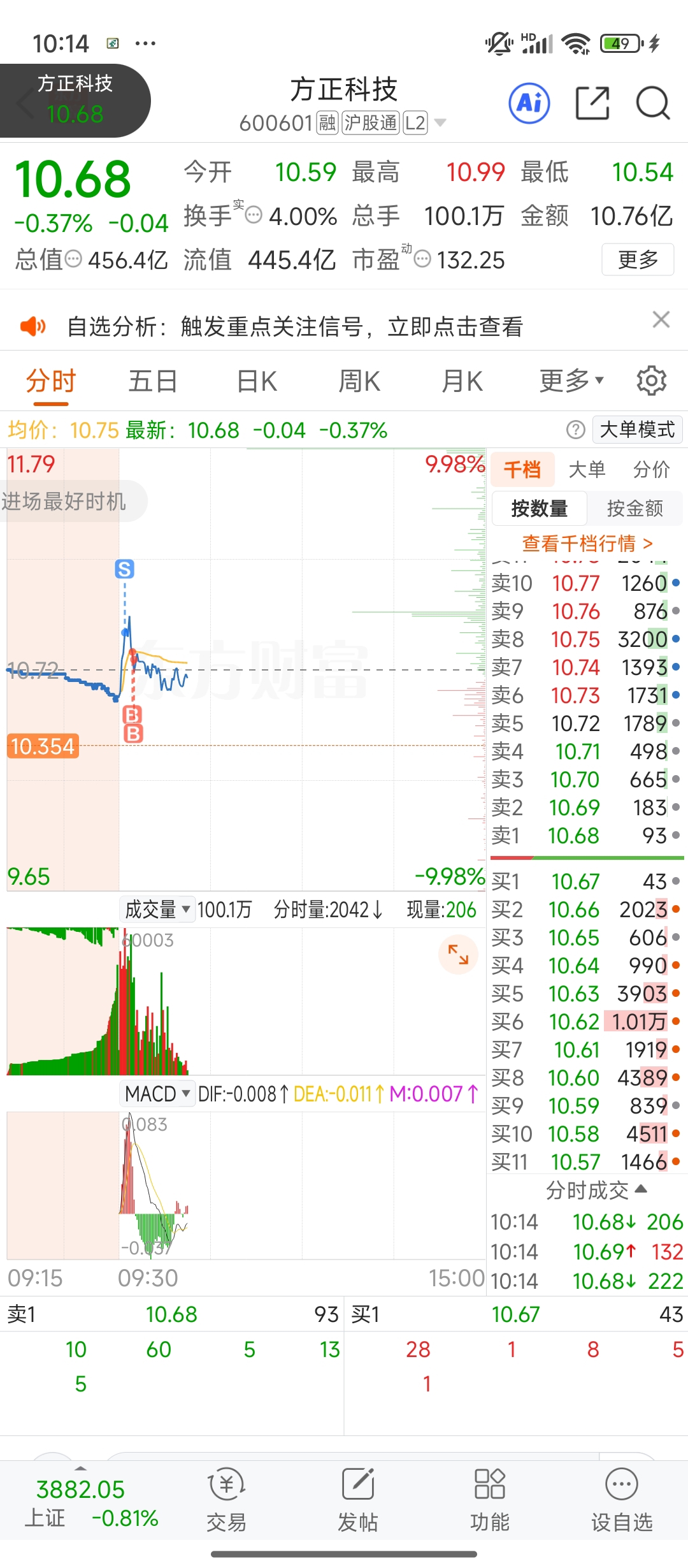 $方正科技(SH600601)$ 做了个t,虽然没做到低点也还行