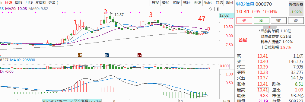 该公司背靠深圳本地国资,深耕光通信领域30余年,聚焦 “光纤光缆 + 智能接入 + J工信息化 + 智能服务” 四大业务,技术储备深厚,拥有1个国家级企业技术中X、多个省市级研发平台,以及3家国家级专精特新 “小巨人” 企业,手握近 600 项有效专利。深圳出台的并购重组相关方案与其发展高度契合。方案支持本地企业重组整合,鼓励在新一代信息技术等领域开展并购,还允许运用并购贷款、定向可转债等工具,并包容对未盈利科技企业的估值。该公司不仅业务方向与方案鼓励领域匹配,还具备产业整合能力与过往并购经验,既曾收购子公司拓展业务,也能通过转让Z产优化布局,有望借助政策红利进一步强化技术与业务优势。昨天特发信息开盘秒板积极响应行动方案的利好,这票的波浪形态也是很明显,且每次底部首板涨停之后,之后都有一波行情,大致的走势跟海立股份差不多,今天如果深圳国改方向还能领跑,则特发信息可以乘胜追击,退潮则等调整。