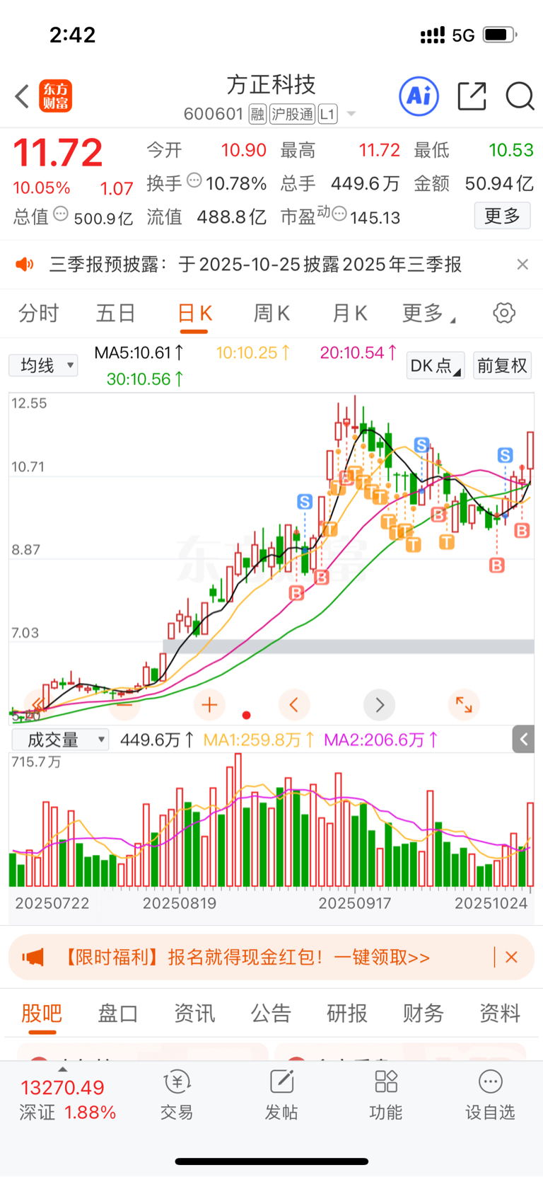 $方正科技(SH600601)$ 我就说底部不远了吧,今晚业绩应该还不错,5日净流入18亿,主力也在赌预期,看好