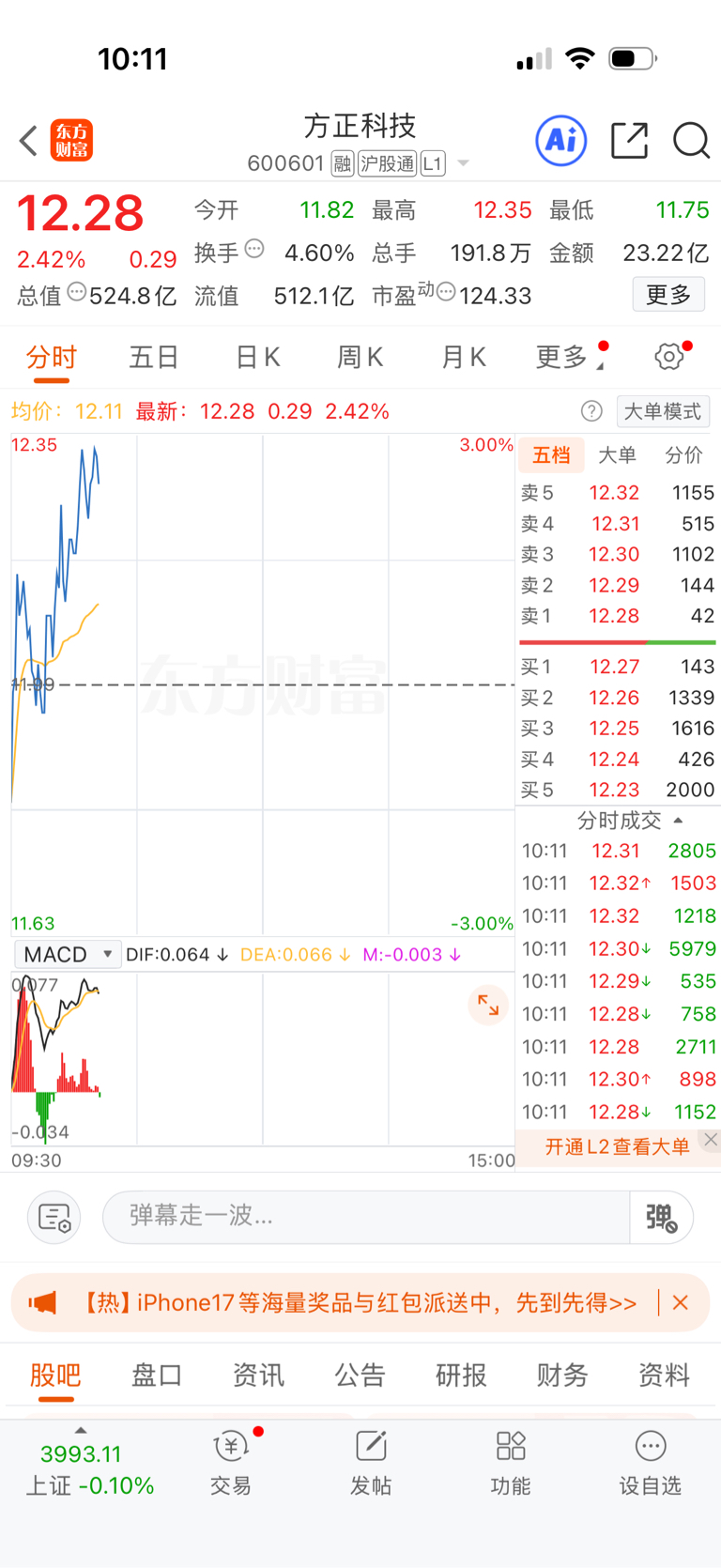 $方正科技(SH600601)$ 主力也是给够脸了、准时那么早上班了。今天会不会来个不一样惊喜呢?有多少人在线等?178[威武]