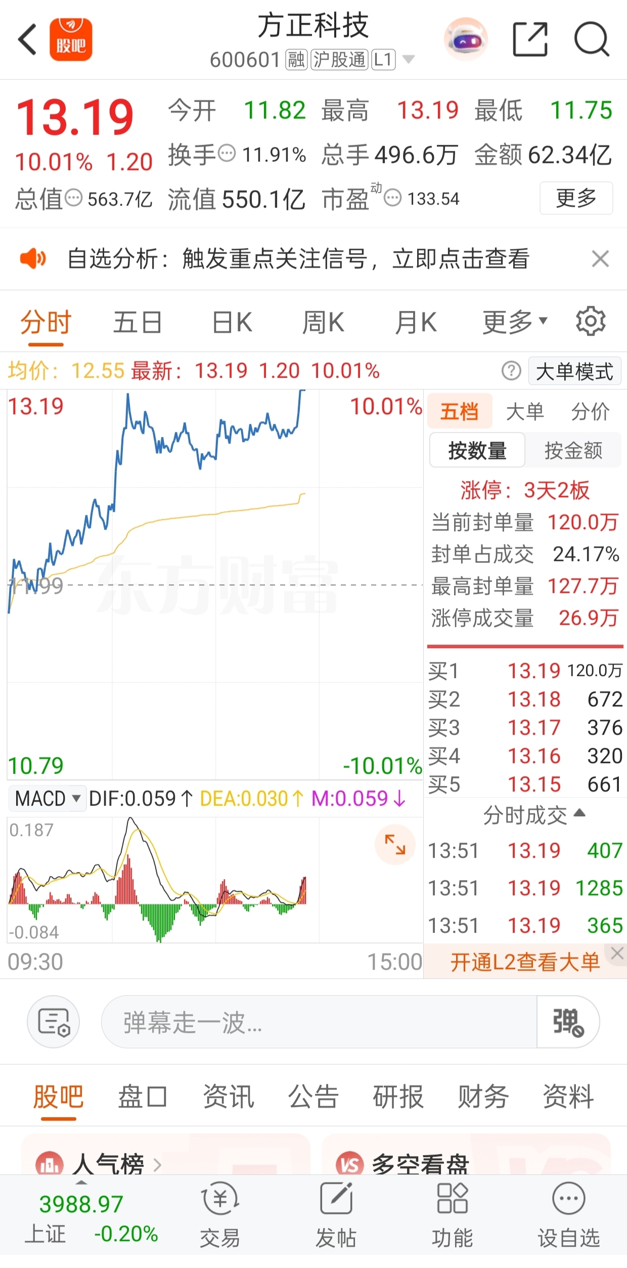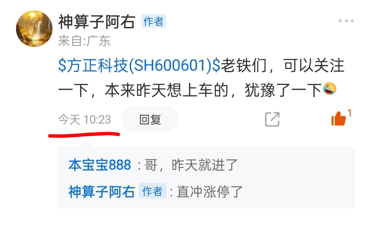 早上推荐出来的$方正科技(SH600601)$ 终于在下午兑现承诺,成功封板,老铁们都跟上了吧,三个点就发出来了