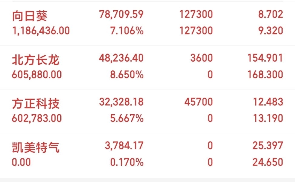 进日新开: $方正科技(SH600601)$ $北方长龙(SZ301357)$ 这两支具有增长潜力,我满怀期待,相信随着后续市场发展,定能达成收益目标……