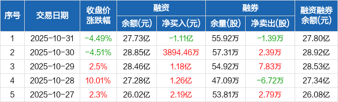 融资方面,当日融资买入3.43亿元,融资偿还4.54亿元,融资净偿还1.11亿元。融券方面,融券卖出1900股,融券偿还1.58万股,融券余量55.92万股,融券余额689.49万元。融资融券余额合计27.8亿元。
