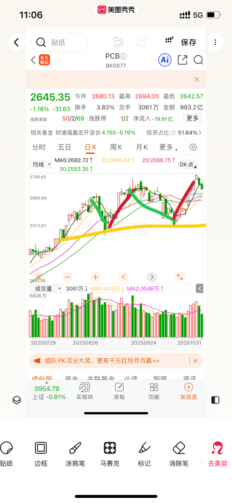 $方正科技(SH600601)$ PCB、CPO指数进入了箱体震荡,易中天、胜宏头部科技进入了调整,方正周一走势极为关键,反包持股,十日线破了就要减仓,从本周科技股筹码峰来看,是有减持迹象的,因为头部公司基金持有的仓位上限,还有两个月要出基金经理排名,基金经理们会做好提前准备,在配合大盘指数11月是有可能维持在横盘箱体震荡,建议不要重仓科技,调仓布局一些避险品种