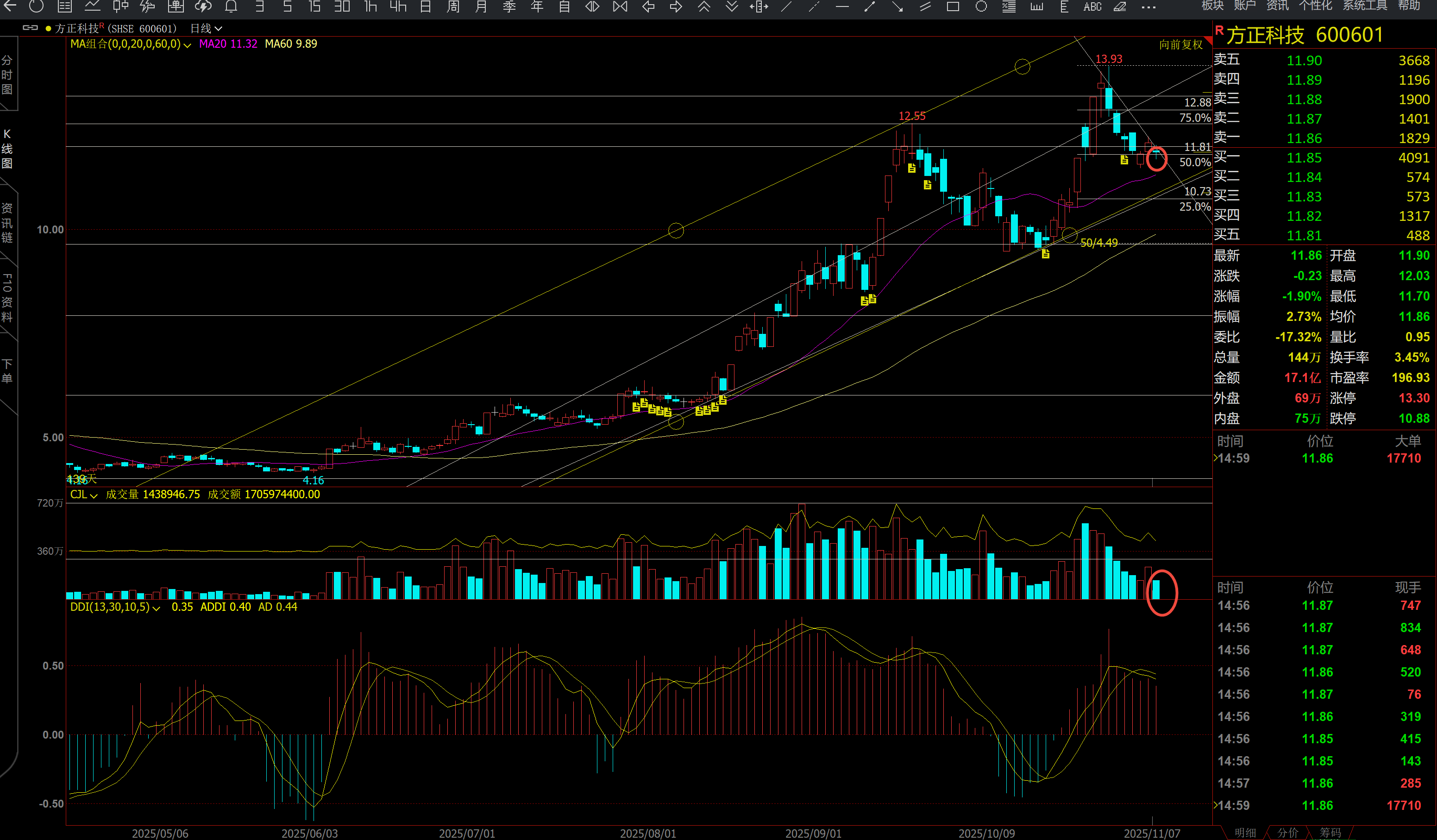 方正科技11月7日分析——耐心等待。如昨天所说,方正科技机中有危,今天选择向下调