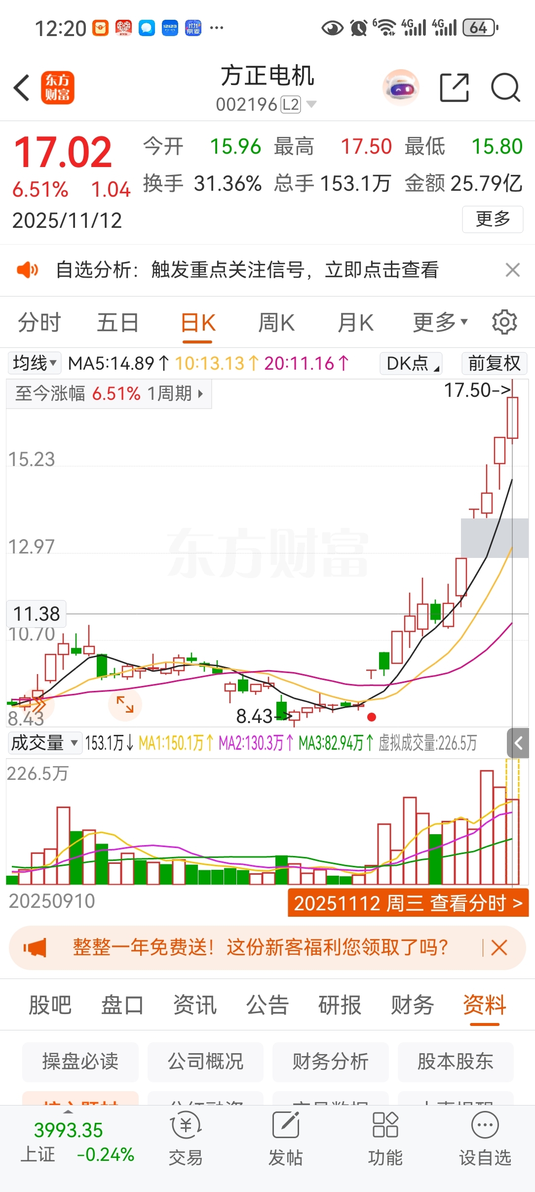 本来是可以发财的,方正电机,跟方正科技2选1,方正电机半个月翻倍了