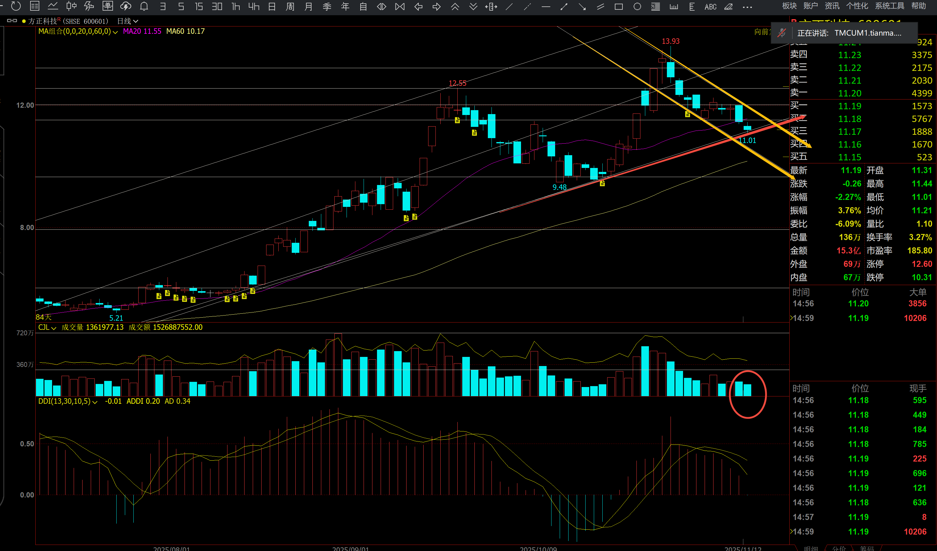 方正科技11月12日分析——到底了。方正科技今天收了一个小阴K线,量能进一步缩小