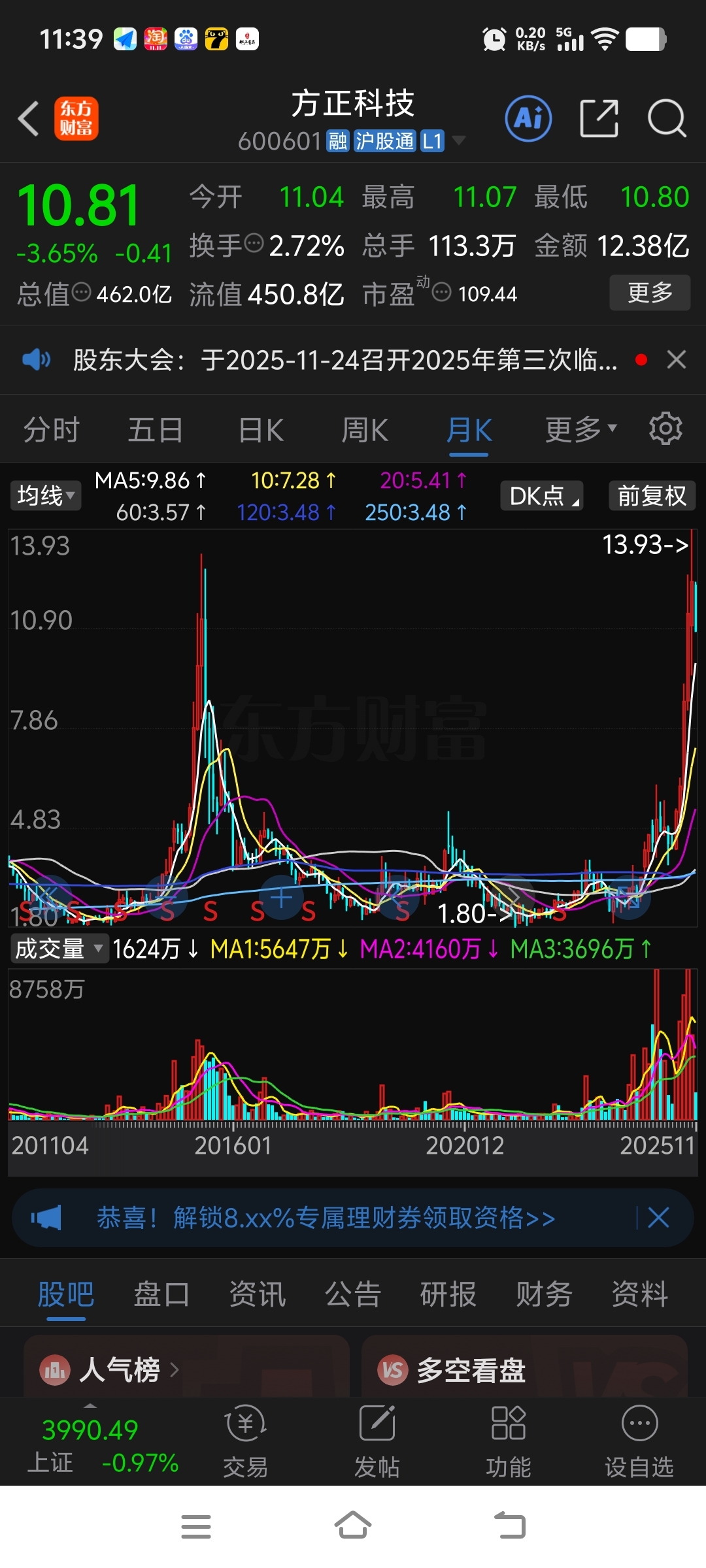 $方正科技(SH600601)$ 看看2015年,下面这个月k线,方正同样从2块炒到13块多,然后用了几年时间都在一路下跌,最后跌回原位。套了一大批人,用了10年时间才解套。
