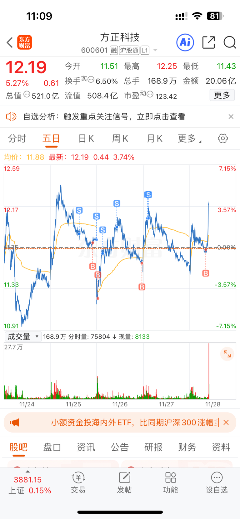 $方正科技(SH600601)$ 昨天尾盘没接回来,今天又给掏着了