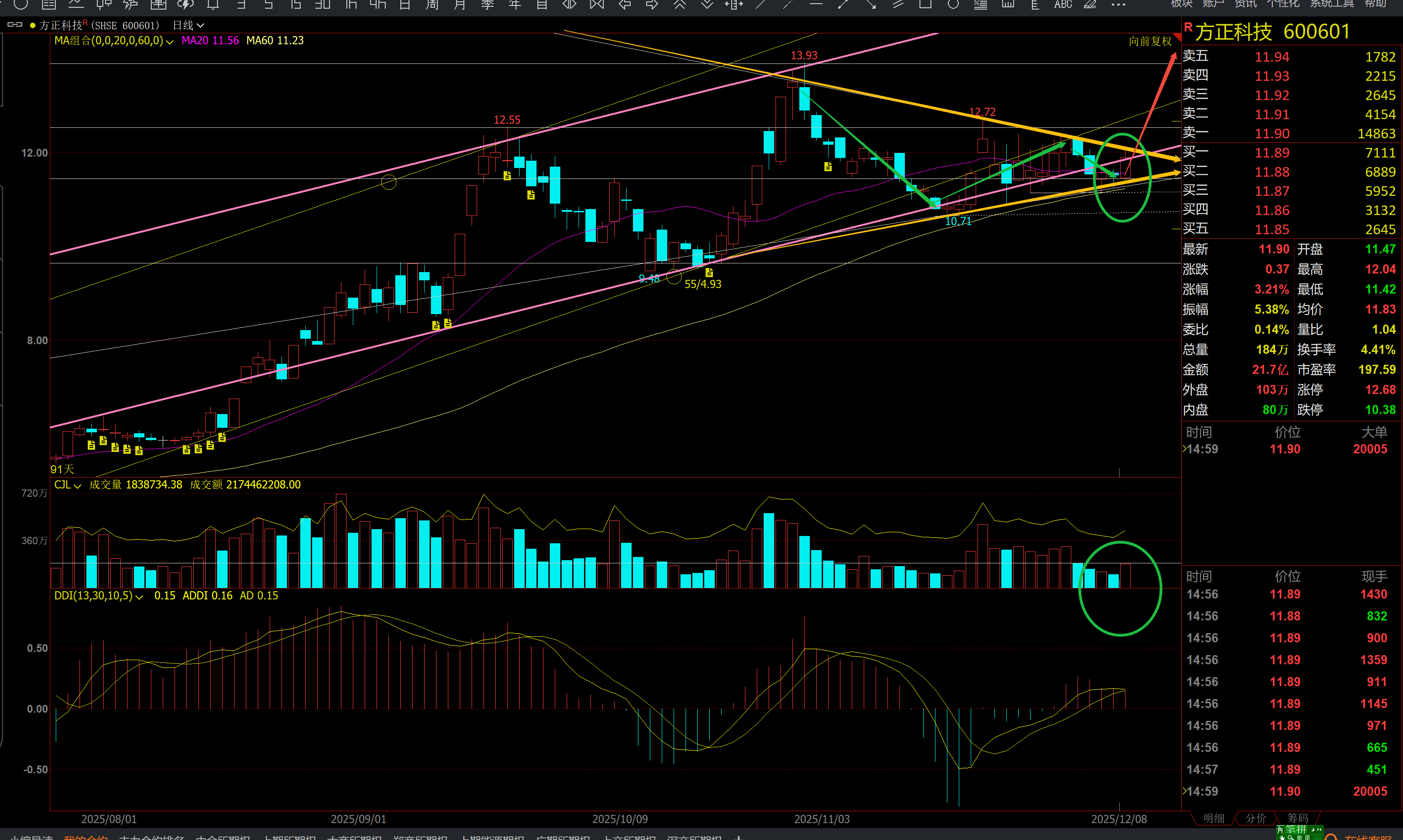 方正科技12月8日分析——走势正常。今天方正科技收中阳线,量能比昨天放大,今天的量能与K线匹配正常,从近段时期来看,方正科技走势都是正常的,我们看到了上涨放量,下跌缩量的正常走势,而且,方正科技近段走势有两个特点:一是12月2日的回调力度明显是小于10月30日到11月14日回调力度,12月2日以来的回调更像在积蓄力量;二是股价被压缩在了一个不断收敛的三角区域,平台越来越高,突破的可能性大大增加。如果向上突破,那么这波的上涨是要创新高的。不管怎样,回调一定不能放量。