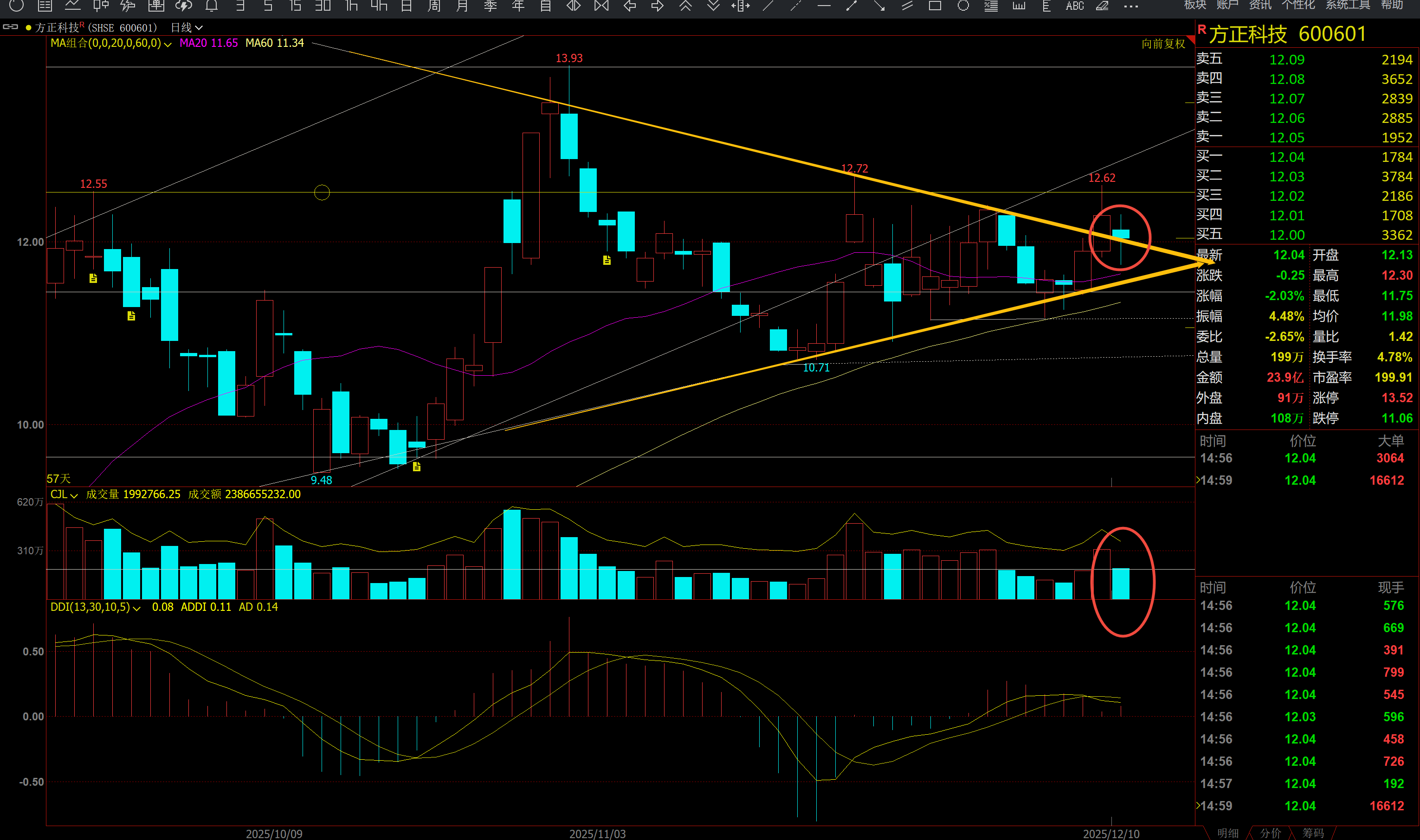 方正科技12月10日分析——主力精准回调。今天方正科技收带下影线的小阴线,量能比
