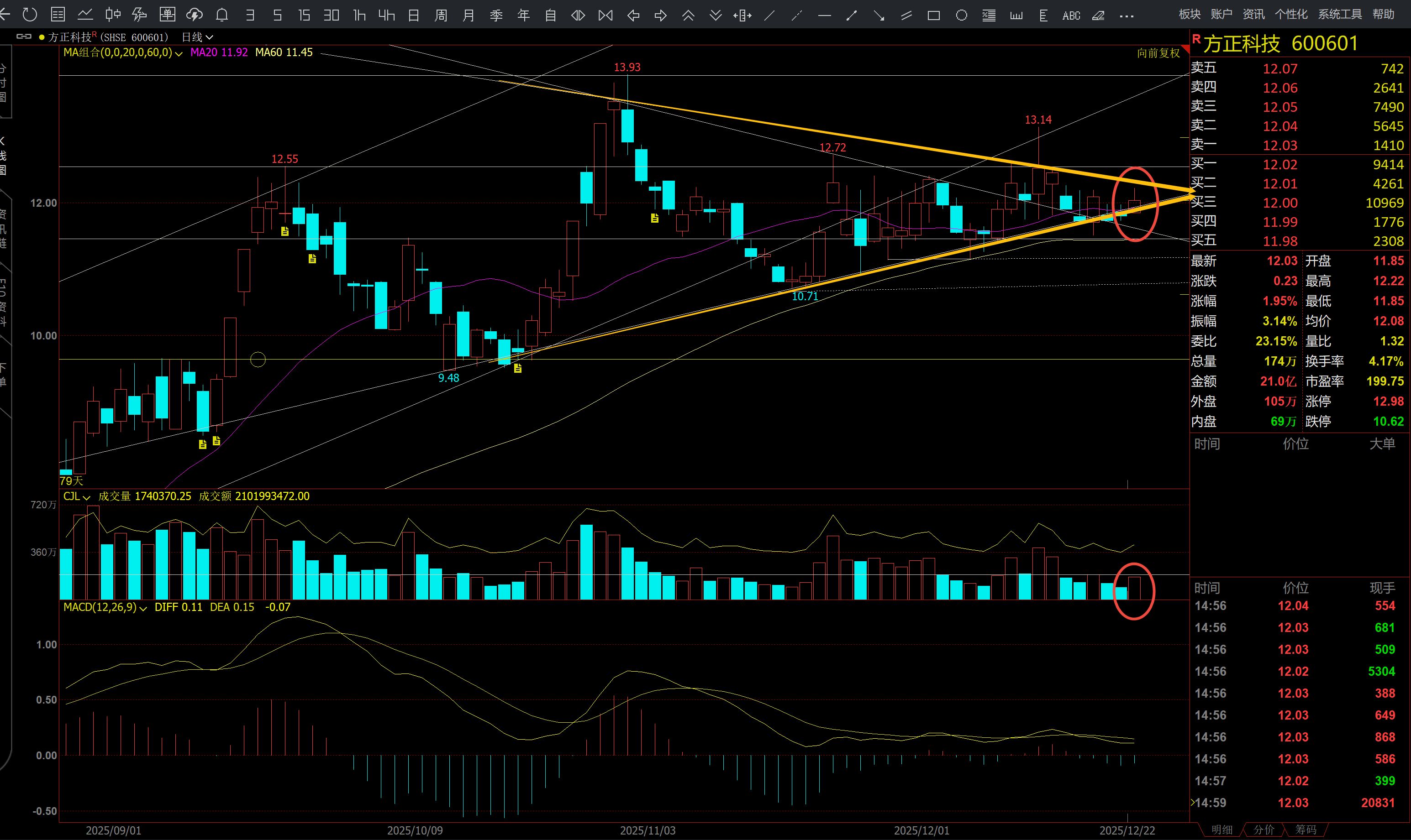 方正科技12月22日分析——秩序正常。今天方正科技收了一个带小上影线的小阳线,成交量比昨天放大,创了昨天新高,没有创新低,方正科技还是处在正常的秩序中(上涨放量,下跌缩量)。方正科技12月11日创了阶段新高,然后又回调,前面划的三角收敛区暂时失效,收敛三角区的上沿得重新画出,所以,今天方正科技的价格处在收敛三角区的下沿支撑位置,没有冲击上沿,前面12.43与12.72就成了压力位。收了一个小上影线,但与今天的K线实体相比,还是不小,说明压力也不小。还是那句话,回调不能放量。