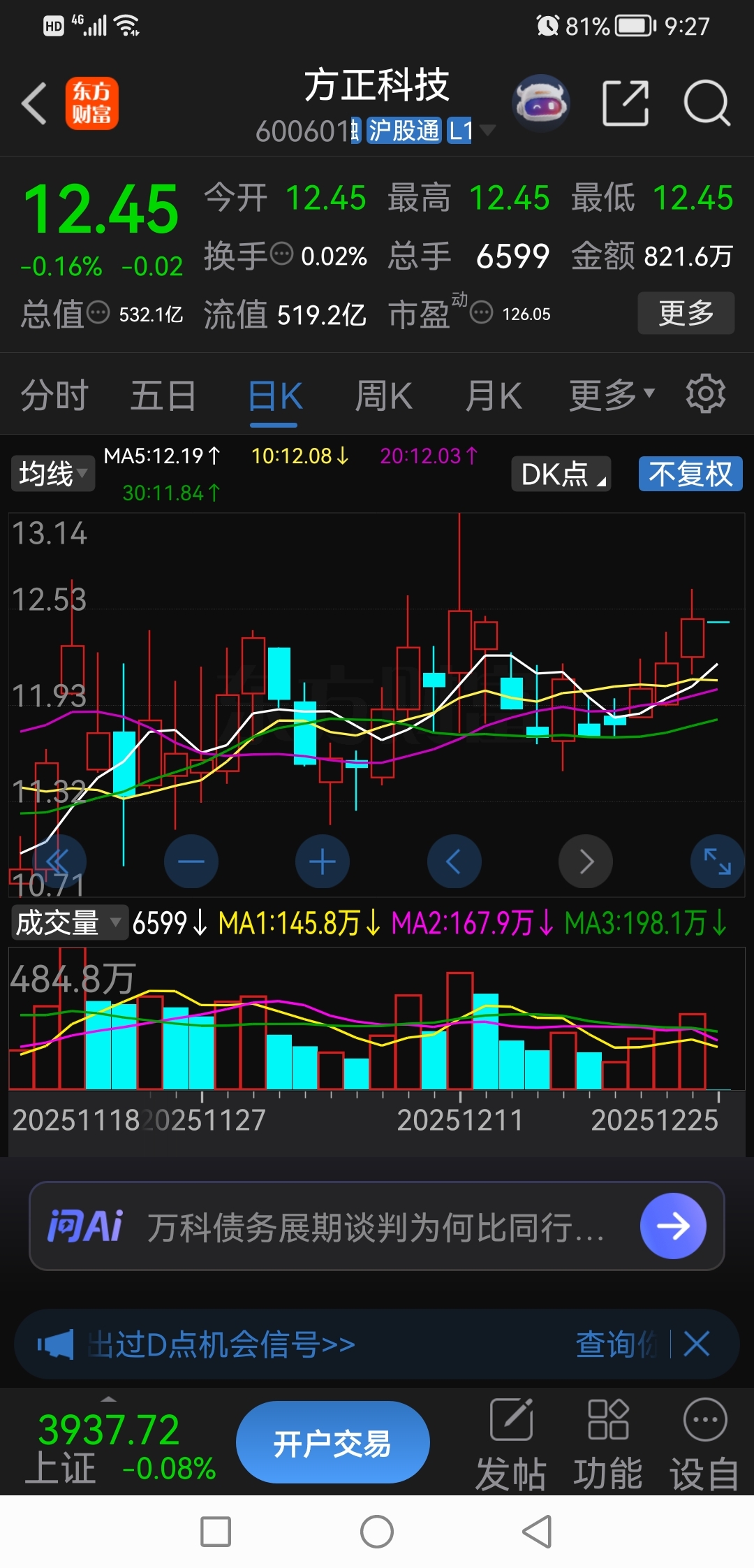 $方正科技(SH600601)$ 新庄家介入较深,持股成本也较高,小方科技含量也很高,后市震荡向上概率大!