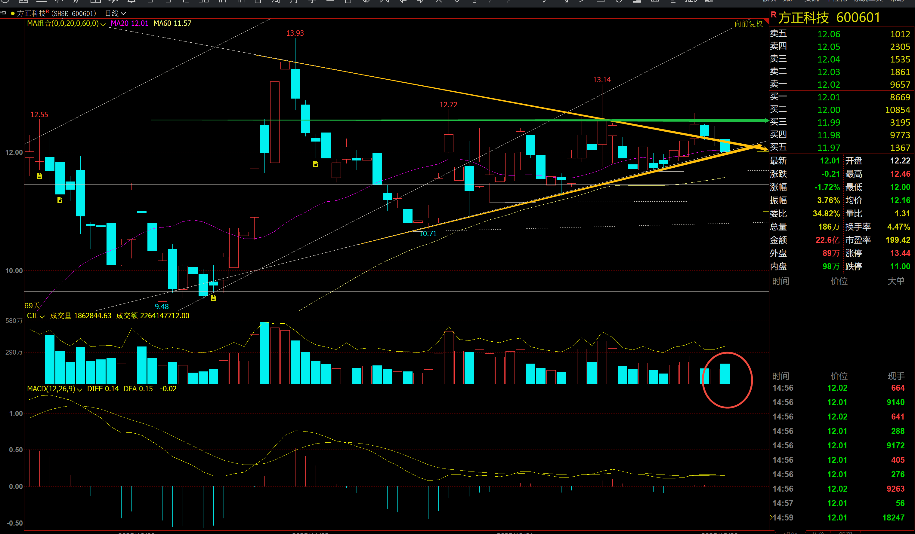 方正科技12月29日分析——注意回调风险。今天方正科技收了一个带上影线的小阴线,成交量比昨天放大,显示有供应扩大的趋势,还好今天收盘收在了收敛三角形的下沿,暂时获得了支撑,不过,今天收了上影线,而且有所放量,供应的压力开始显现,回调的风险大增。希望价格能在11.7附近站稳,这样,上升趋势还没有打破,否则,要向下回调了。
