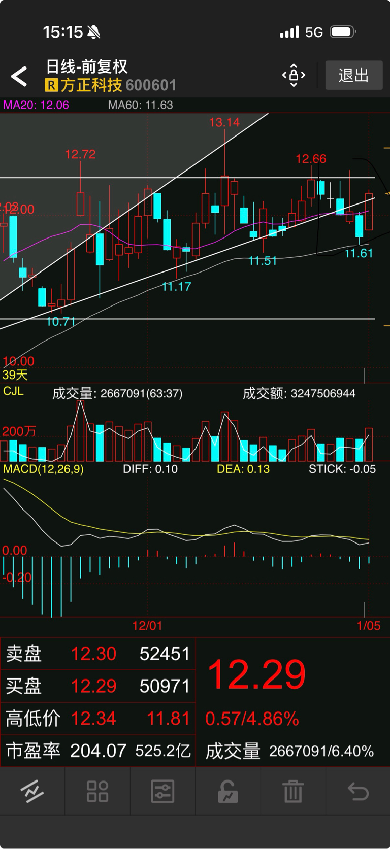 $方正科技(SH600601)$ 方正科技1月5日分析—新征程、新高度。方正科技今天收大阳,量能创31日新高,今天量能配合完美,重回三角区,去年我们说,希望价格在11.7止住,趋势不变,目前看,上升趋势继续,12.7的压力位就像一层薄薄的窗户纸,一捅即破,2026年,AI依然如火如荼,方正科技一定能创出新高度。