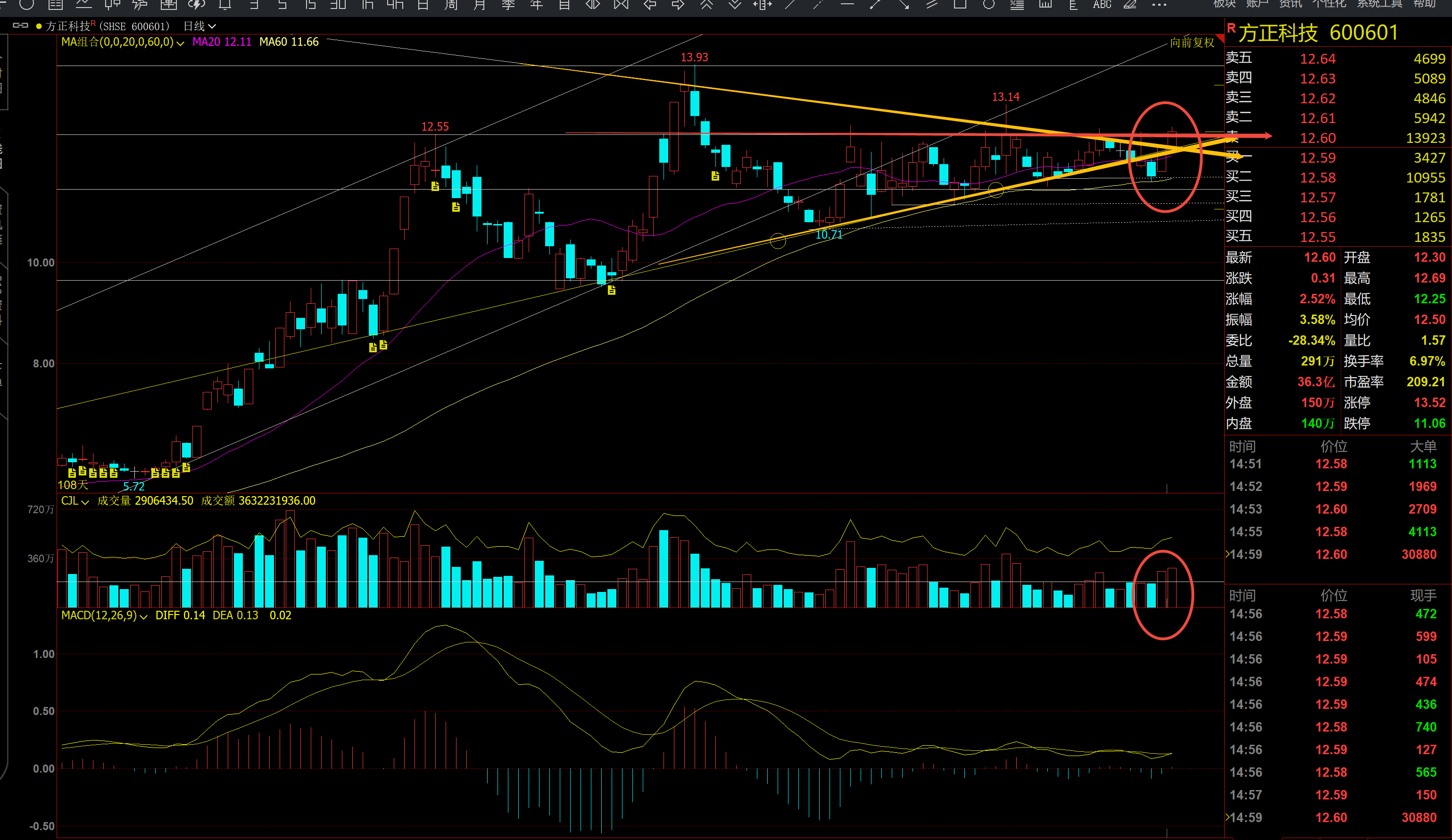 方正科技1月6日分析——蓄势待发。今天方正科技突破压力位12.55,没有回调,量能比昨天放大,有需求进来了,量价配合完美,这是非常正常的走势,今天方正科技势能很足,一方面站上了收敛三角形的上沿,另一方面也突破了压力线,低点也在不断的抬高,这样的话,向上突破的概率大大增加,如果回调考验12.55,应该是一个小K线+小量的回调,这样向上的动能会更足。总之,方正科技已经箭在弦上,蓄势待发了。