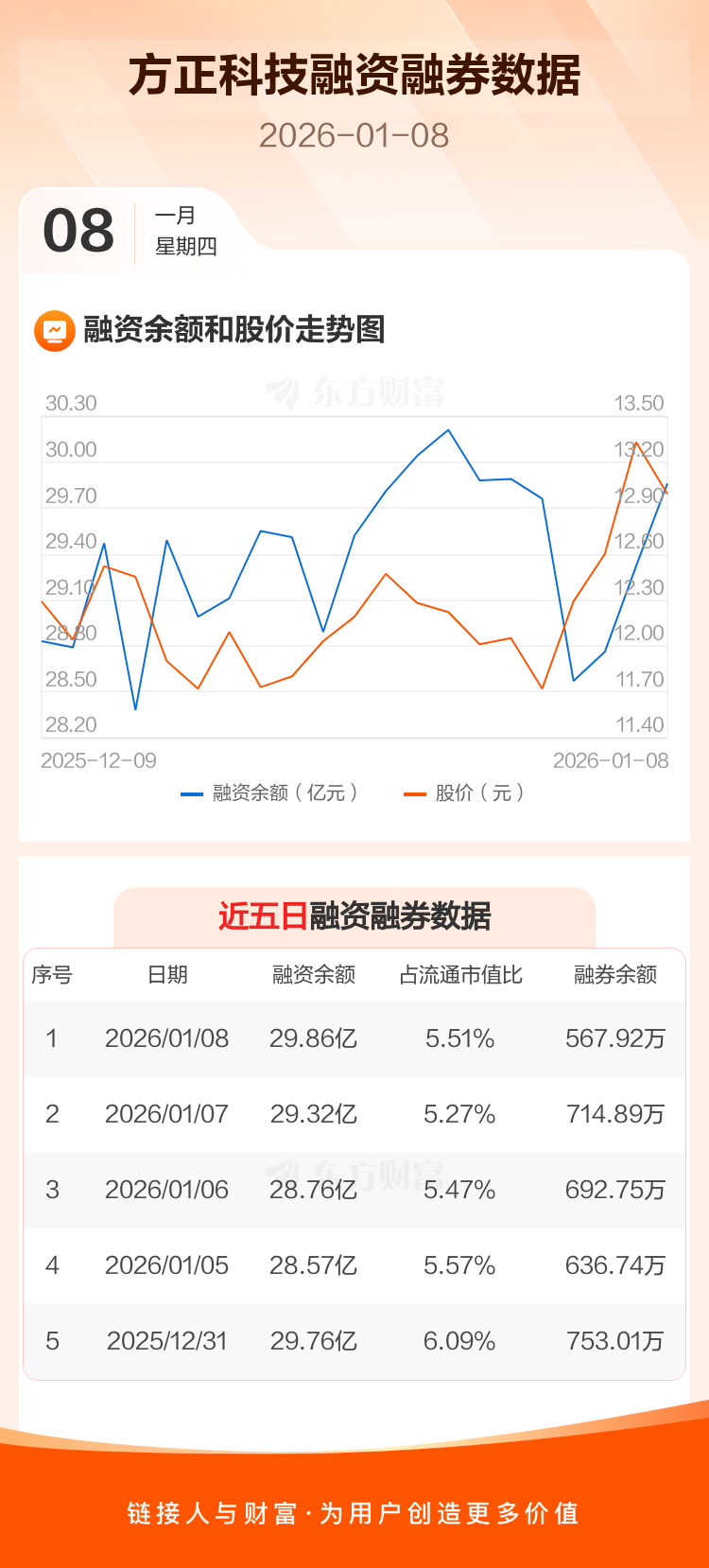 交易所最新数据显示,方正科技于2026年1月8日获融资买入5.24亿元,融资偿还4.70亿元,当日融资净买入5406.65万元。目前,该股融资余额29.86亿,占流通市值比例为5.51%。