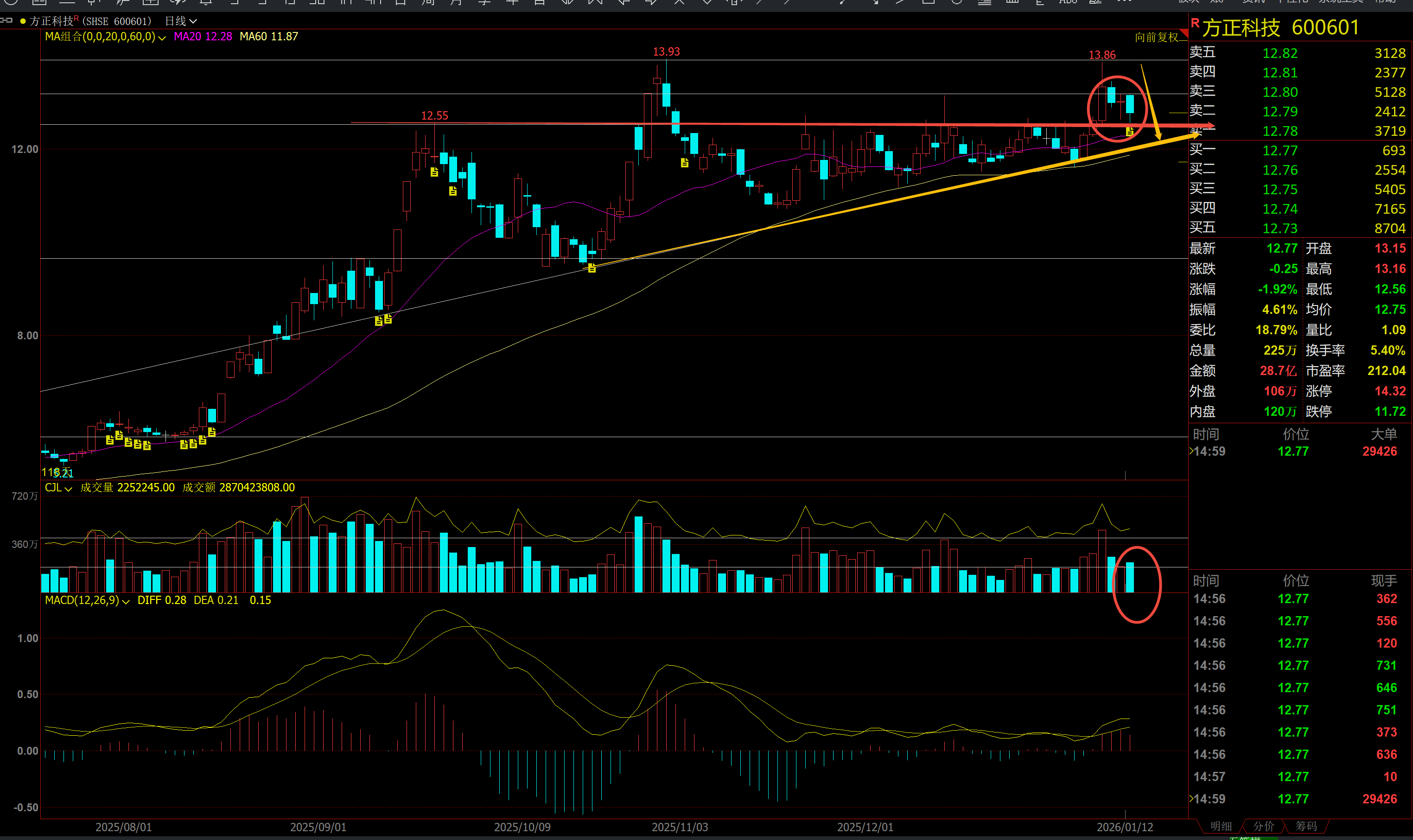 方正科技1月12日分析——秩序正常。今天方正科技收了一个带下影线的中阴线,量能比